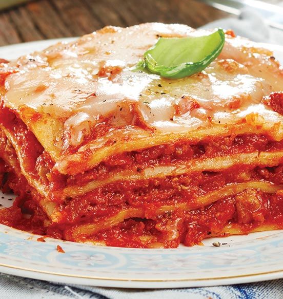 Notre lasagne la meilleure et la plus copieuse déborde tout simplement de viande, fromage et sauce ! Jetez-vous sur ce favori au goût maison fait avec  une combinaison  savoureuse de bœuf et de porc dans une sauce piquante et infusé au vin blanc étalée entre de pâtes à lasagne et un mélange de fromages mozzarella, ricotta et Romano.